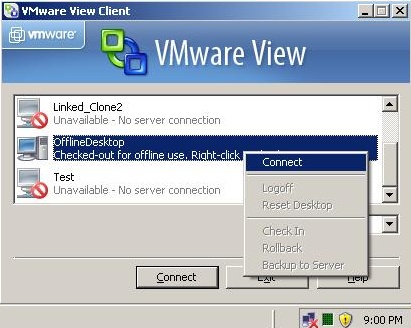 Все последующие соединения View Client с Offline Desktop будут перенаправляться к онлайн десктопу (будут вновь задействованы ресурсы ESX хоста) до тех пор, пока виртуальная машина не будет выгружена заново.