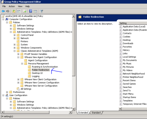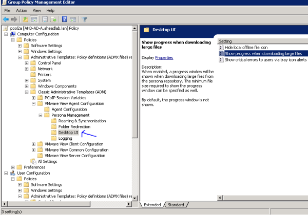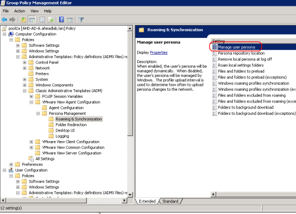 Управление профилями происходит с помощью групповых политик, заданных в шаблоне ViewPM.adm, который является основным шаблоном GPO для View Persona. Находится он на View Connection Server по следующему пути:
