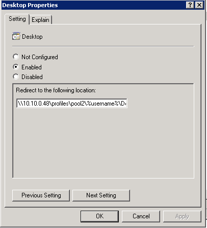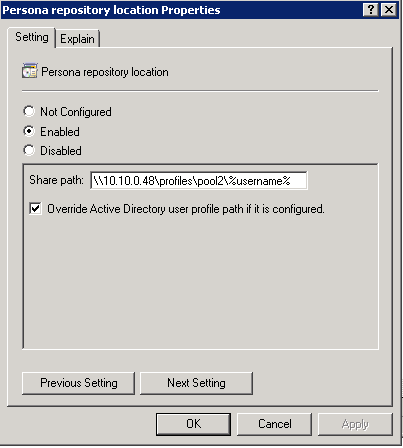 Далее выбираем объект GPO "Persona Repository Location" и указываем сетевую шару, где будут храниться профили. В данном случае используем переменную окружения %username%: