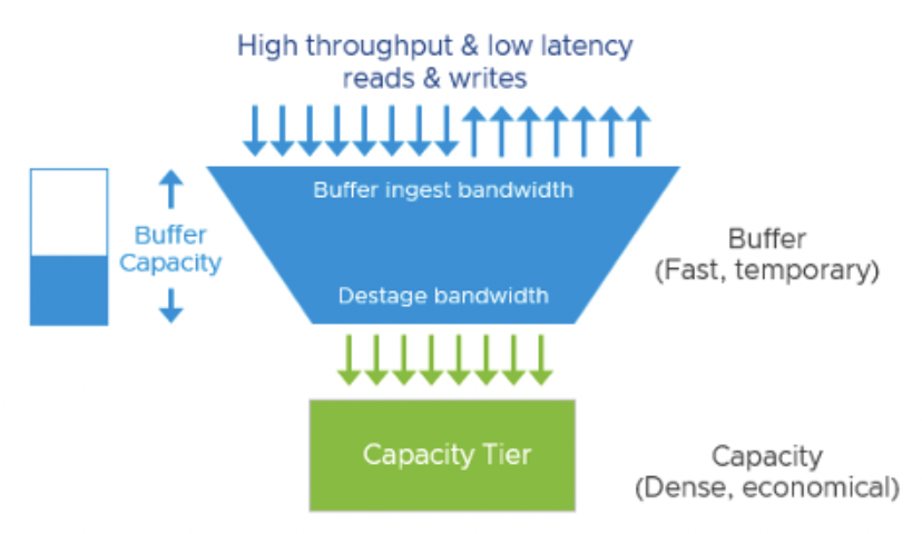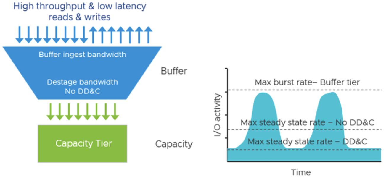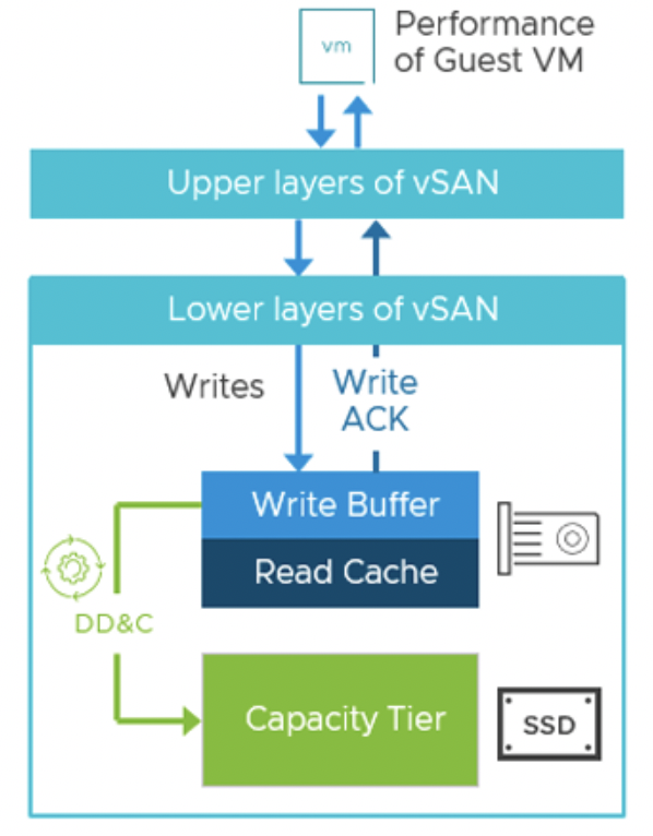 Отсутствие дисковых групп и двухуровневого кеша. ESA использует единый пул NVMe-накопителей с лог-структурированной файловой системой. Запись данных происходит в виде последовательного журнала, и параллельно могут вычисляться паритеты, не влияя на быстрый прием записи. Например, vSAN ESA может сразу записывать данные в performance leg (быстрый слой) с применением RAID-6, что дает одновременно подтверждение записи ВМ и расчет паритета без задержек. Отсутствие этапа "destaging" с Read-Modify-Write снижает накладные операции.