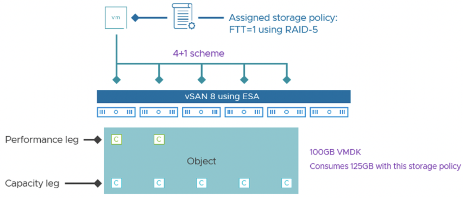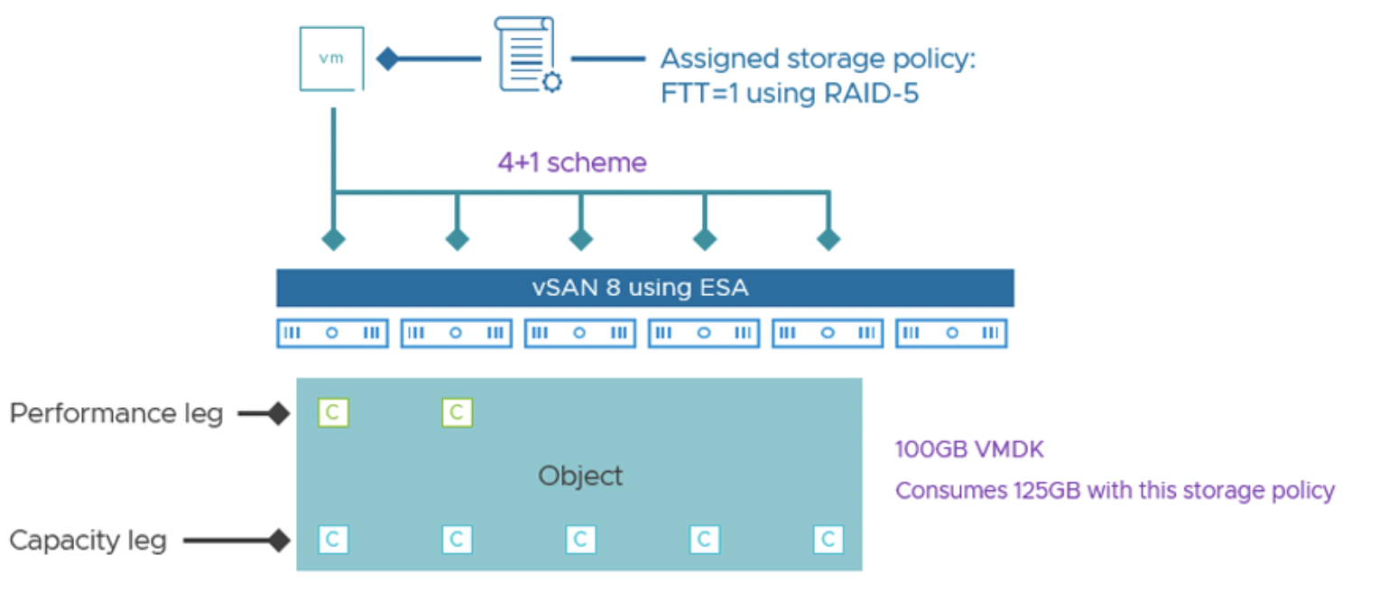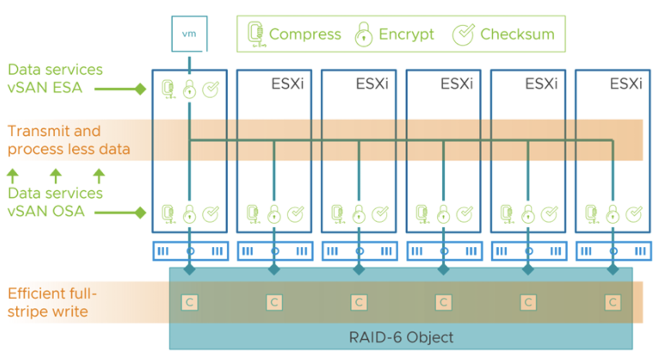 Оптимизированный расчет паритета. Алгоритмы в ESA и задействование современных CPU позволяют вычислять паритеты очень быстро. Кроме того, LFS объединяет мелкие записи в большие блоки ("логические группы записей"), что делает операции кодирования более эффективными – меньше случаев частичного обновления страйпа. Благодаря этому ESA практически избавилась от эффекта I/O amplification, ранее характерного для RAID-5/6. VMware заявляет, что при работе RAID-5/6 в ESA нет дополнительной нагрузки на CPU/IO по сравнению с зеркалом.