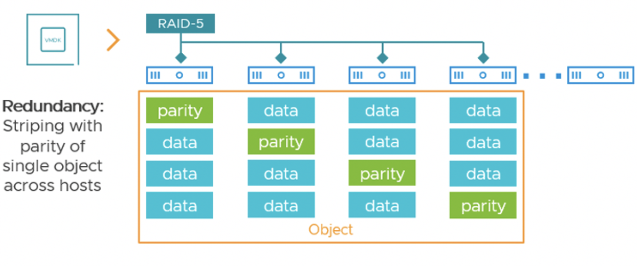 При политике RAID-5 (FTT=1, метод RAID-5) vSAN размещает каждый объект в виде 4 компонентов на разных хостах: 3 фрагмента данных и 1 фрагмент паритета. Любой один хост (или устройство) из этих четырех может выйти из строя – данные восстанавливаются из оставшихся 3 фрагментов.