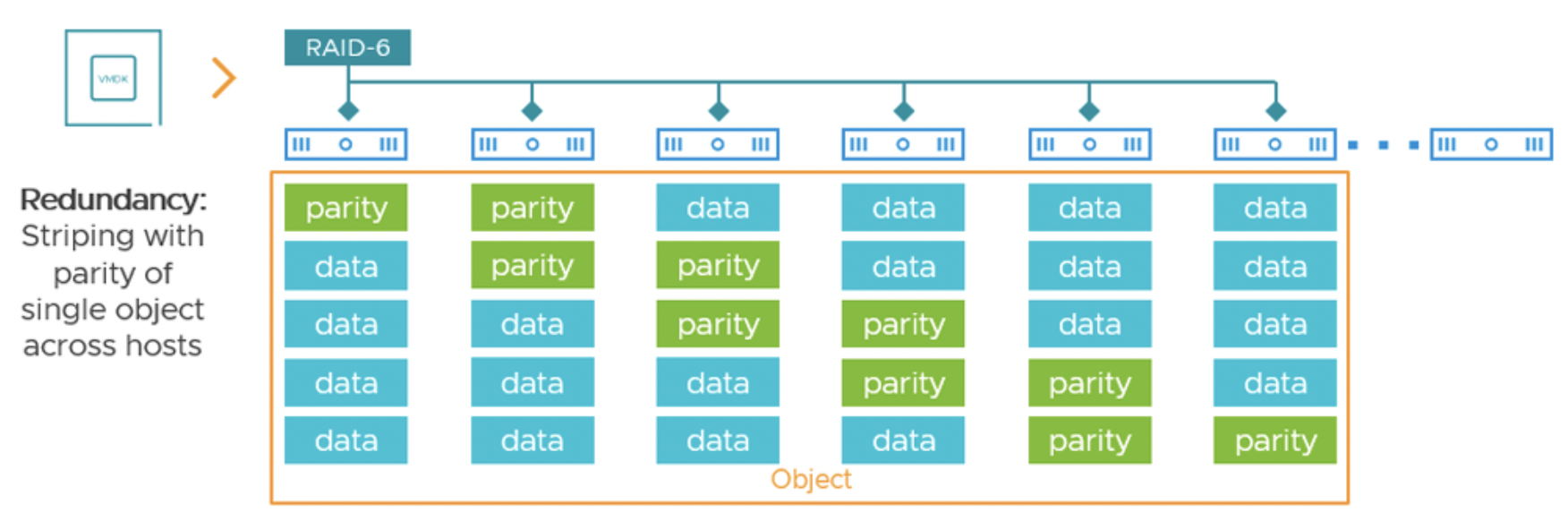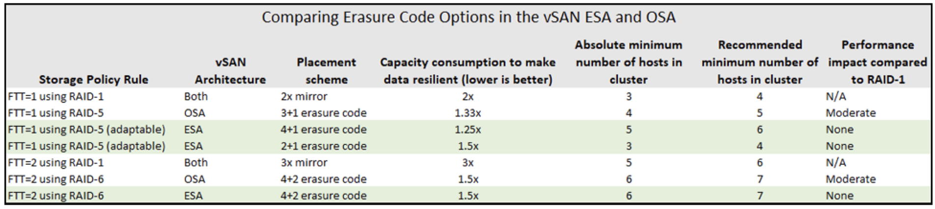В классической реализации (OSA) vSAN поддерживает RAID-5 и RAID-6 на all-flash кластерах начиная с версии 6.2. Они недоступны на гибридных (с HDD) конфигурациях, поскольку использование медленных дисков с кодированием приводило бы к неприемлемому падению производительности. Требуется минимальное число узлов в кластере: для RAID-5 – 4 хоста (схема 3+1), для RAID-6 – 6 хостов (схема 4+2). Рекомендуется иметь на один узел больше минимального, чтобы в случае выхода узла из строя была возможность автоматически восстановить недостающие компоненты (rebalance) на свободном узле, не дожидаясь починки отказавшего.