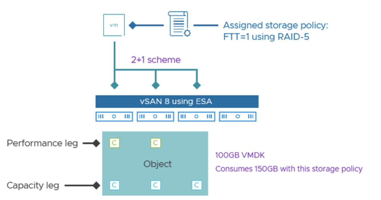 Новая архитектура ESA устраняет большинство недостатков, связанных с производительностью RAID-5/6. Главная идея состоит в том, что vSAN ESA благодаря обновленному механизму записи (журналируемая файловая система LFS и пр.) достигает производительности RAID-1 при использовании RAID-5/6. Проще говоря, теперь можно иметь экономию емкости, но без традиционных штрафов на скорость.