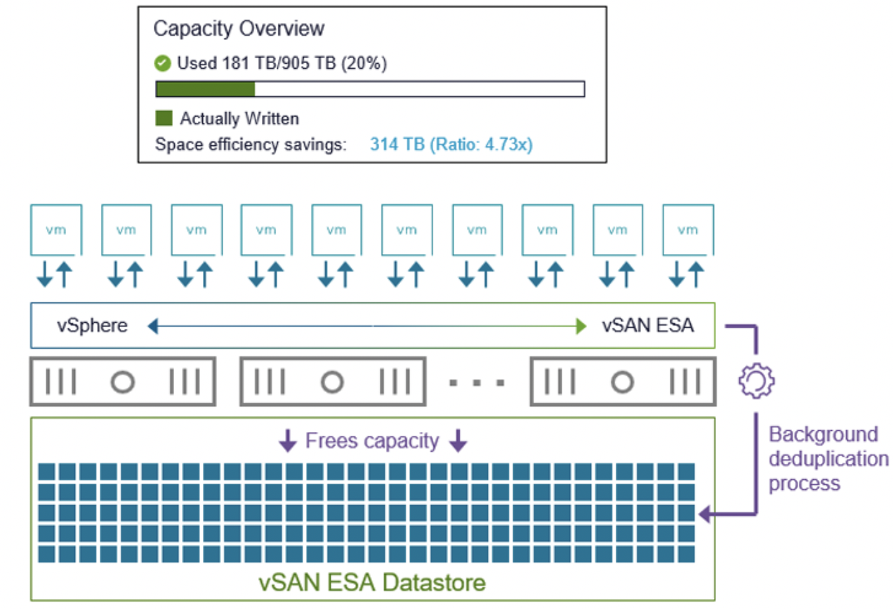 Технически глобальная дедупликация в ESA основана на специальных объектах vSAN, создаваемых при включении этой функции. Выделяется объект метаданных дедупликации (хранилище хэш-индексов для всех блоков) и один или несколько объектов данных дедупликации (хранилища уникальных блоков). Когда обнаружен дубль, система обновляет метаданные, указывая на уже существующий блок в объекте данных, и освобождает место, ранее занимаемое дублирующим блоком. При этом уникальные блоки "перекочевывают" из исходных объектов ВМ в специальное хранилище дедупликации – такой дизайн нужен, чтобы избежать ситуации, когда множество ВМ начинают ссылаться на блок, лежащий в одном файле какой-то одной машины (что затруднило бы управление). Вместо этого общие блоки выносятся в отдельный пул, к которому затем привязаны все ссылки. Эта архитектура повышает отказоустойчивость и упрощает обслуживание, хотя и является сложнее внутренне.ё