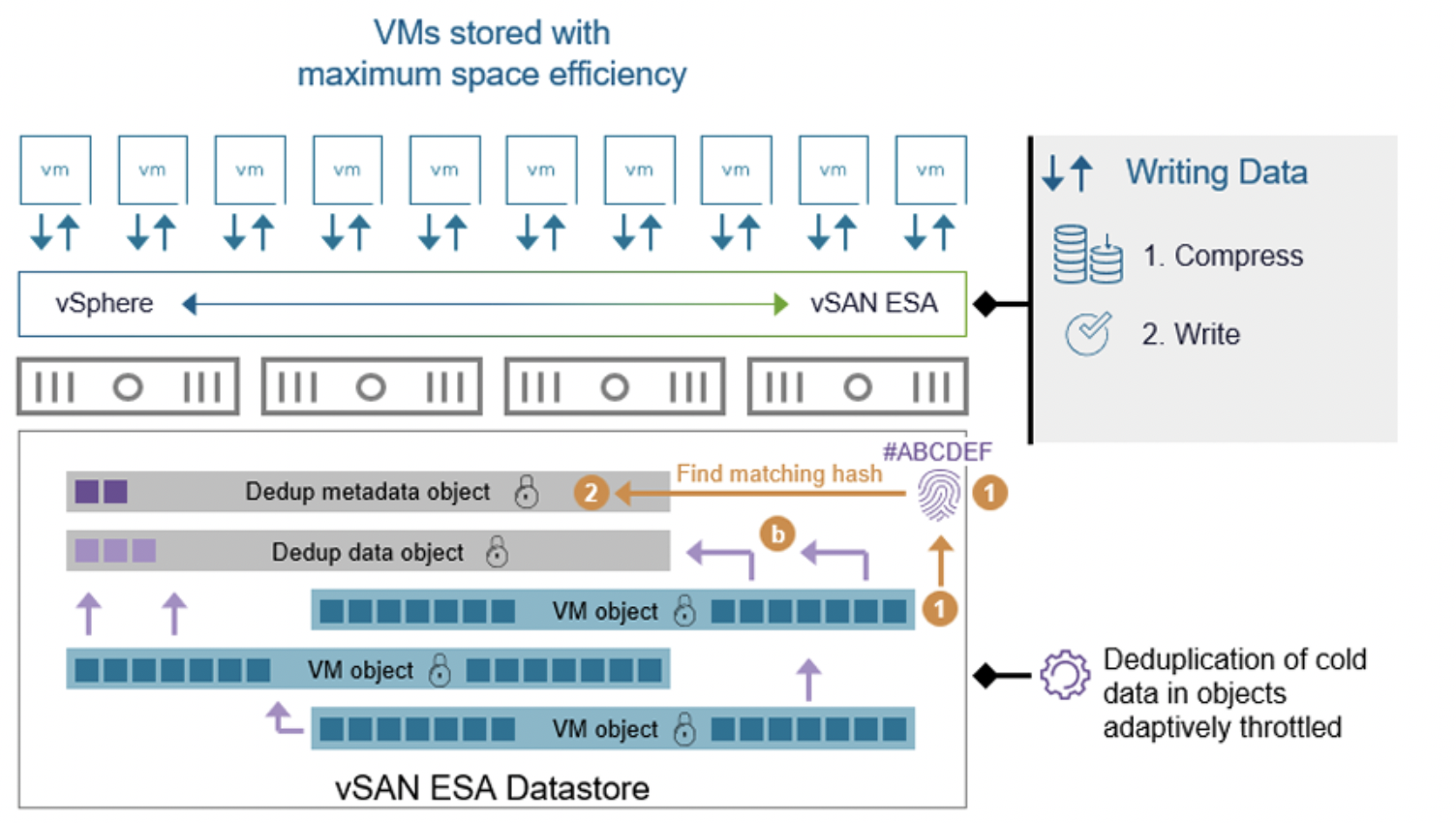 Глобальная дедупликация в ESA реализована как постпроцесс – она работает асинхронно, вне пути основного потока записи. vSAN сначала записывает данные (сжимает их – об этом далее) и подтверждает запись, а дедупликация выполняется позже, не вмешиваясь в операцию ack-write. Такой подход, наряду с интеллектуальным управлением ресурсами, означает, что влияние дедупликации на производительность минимально. vSAN ESA умеет адаптивно дозировать ресурсы на дедупликацию в зависимости от загрузки: во время пиковых нагрузок процесс замедляется до минимального, чтобы не влиять на активные ВМ, а в периоды простоя ускоряется, перерабатывая накопившиеся данные.