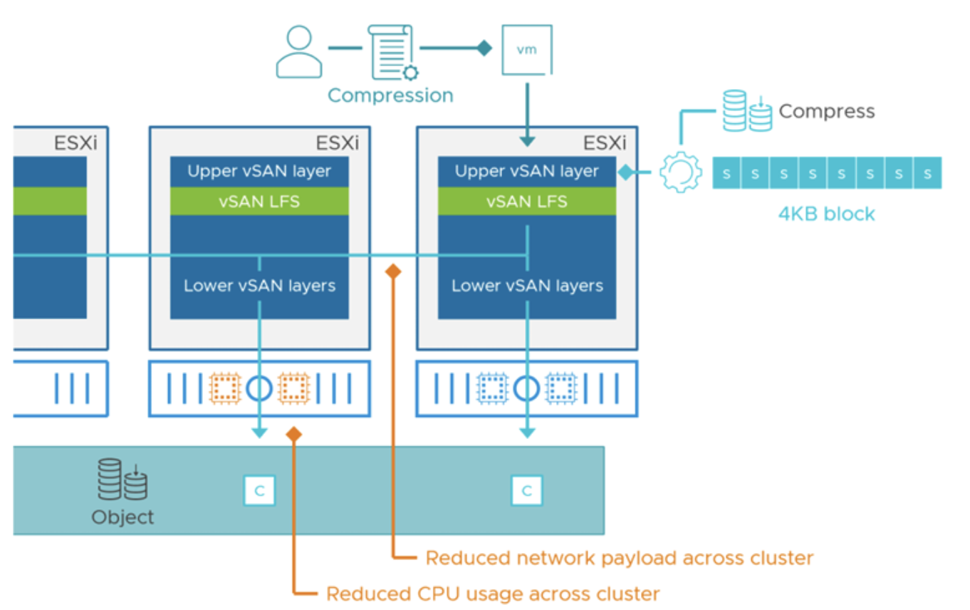 Уменьшается объем сетевого трафика между узлами (vSAN отправляет меньше данных, так как они ужаты).