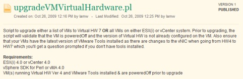 Данный перл-скрипт для VMware vSphere от известного уже вам Вильяма Лама позволяет проанализировать виртуальную инфраструктуру на наличие виртуальных машин на ESX с версией 4 Virtual Hardware и обновить ее до Virtual Hardware version 7.