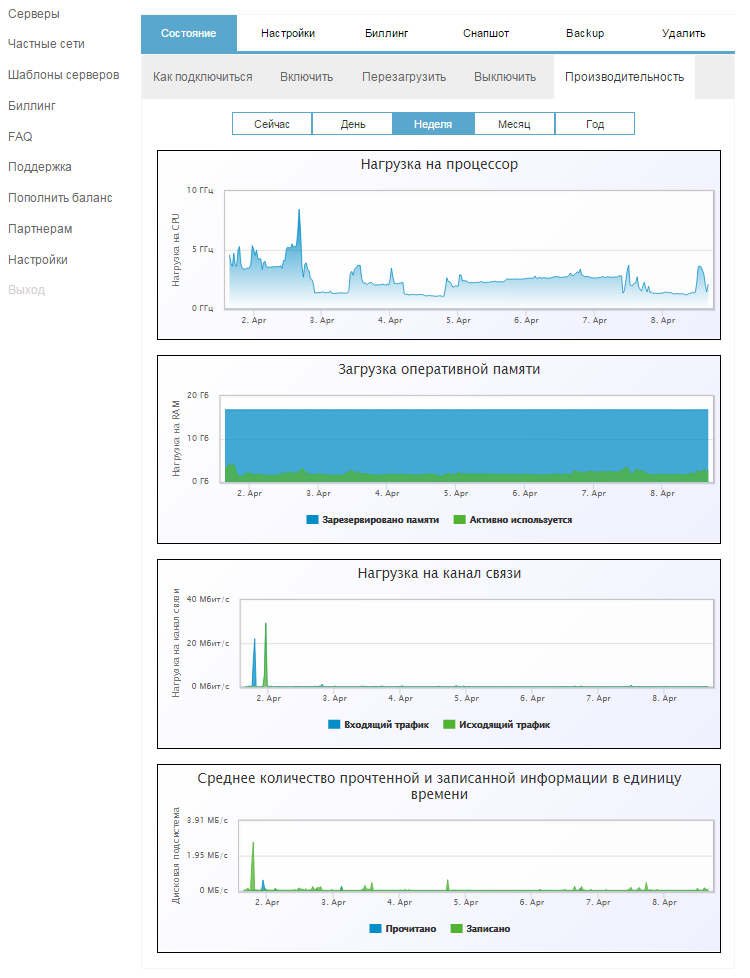 Теперь клиенты хостинга 1cloud в режиме реального времени могут видеть состояние своих серверов. Имея возможность быстро оценить текущую нагрузку, пользователь способен очень гибко управлять инфраструктурой. В моменты «всплесков активности» владелец сервера просто добавляет новую виртуальную машину, и отключает её, когда происходит «спад».