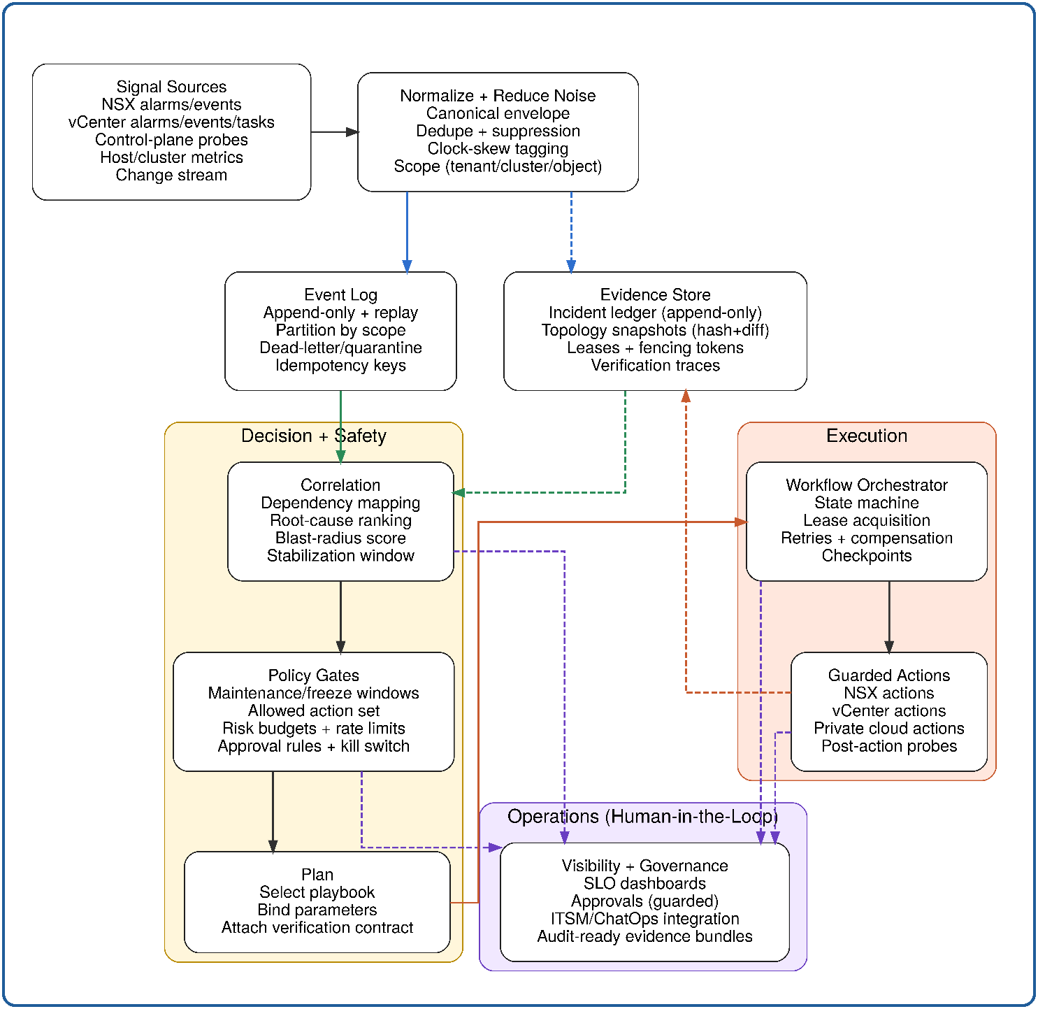 Оператор, обрабатывающий каждую тревогу независимо, продлевает инцидент, повторно проходя один и тот же путь распространения сбоя с каждым действием. В условиях производственных масштабов распространение сбоев NSX стабильно опережает ручную сортировку инцидентов. Система автономного самовосстановления приватного облака Azure VMware Solution — это архитектура управления с замкнутым контуром, созданная для устранения именно этого класса сбоев. Система коррелирует сигналы плоскости управления причинно-следственным образом с использованием динамического графа зависимостей в реальном времени, применяет полный стек политик-шлюзов перед любым автоматическим действием, захватывает ограниченное взаимное исключение перед началом выполнения и независимо верифицирует восстановление прежде, чем закрыть инцидент. В данной статье описываются архитектура системы и принятые проектные решения.