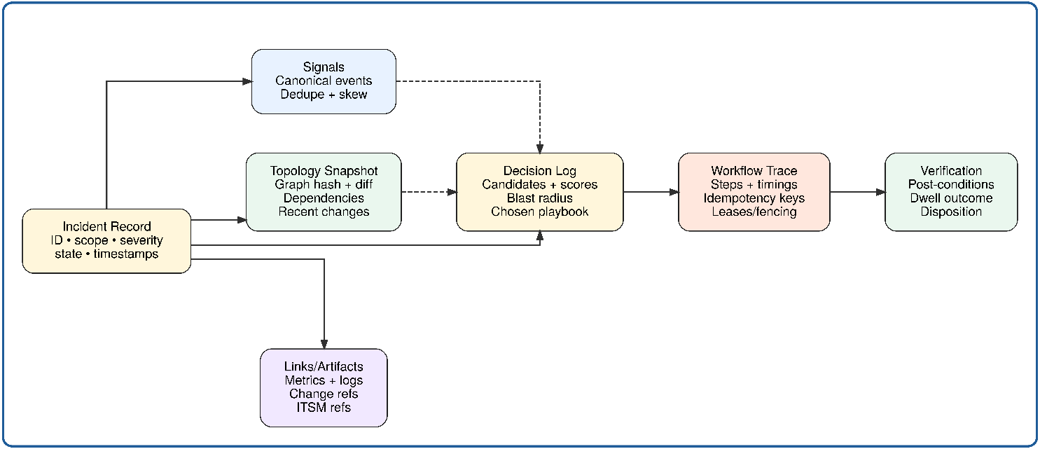 Автономное самовосстановление формирует структурированный журнал с возможностью только дополнения для каждого инцидента вне зависимости от пути разрешения. Последовательно фиксируются пять категорий: необработанные и нормализованные сигналы с результатами подавления; снимок топологии на момент обнаружения; полная запись решений, включая результаты корреляции, ранжирование первопричин, оценку радиуса проблемы и трассировку оценки шлюза; трассировка workflow с метаданными шагов и идентификаторами аренды; и результат верификации с результатами постусловий и диспозицией окна стабильности.