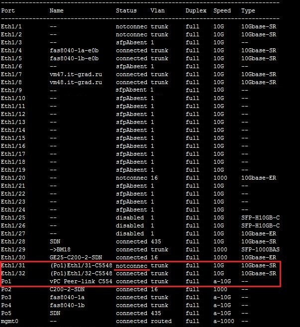 Интерфейсы Eth1/31 и Eth1/32 собраны в Port Channel 1 (Po1). Как видно из скриншота ниже, при падении одного из линков, Po1 остается активным и не происходит потери связности между коммутаторами.