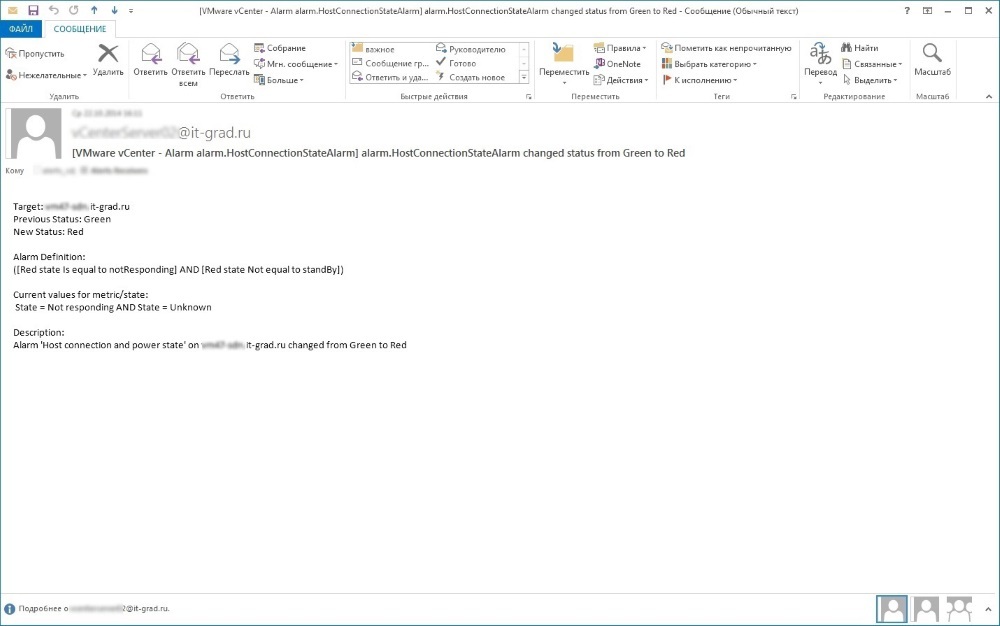 Мы выключили один из рабочих ESXi-хостов, на котором в момент выключения находились тестовые машины разных ОС (Windows, Linux). Отключение эмулировало состояние падения рабочего хоста. После срабатывания триггера недоступности хоста (и виртуальных машин на нем), начался процесс перерегистрации ВМ на второй (рабочий) хост. Затем ВМ успешно на нем запустились в течение нескольких минут.