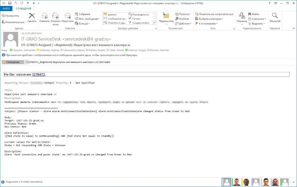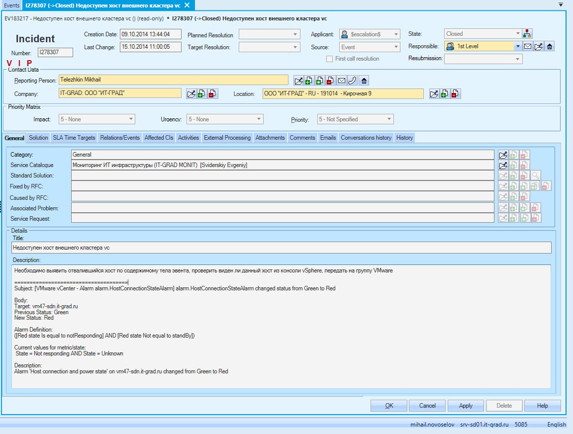 ITSM система разбирала эти письма по шаблонам и создавала события. На основе одинаковых событий автоматически комплектовались инциденты. Вот один из инцидентов, который был создан ITSM системой на основе событий в системе мониторинга.
