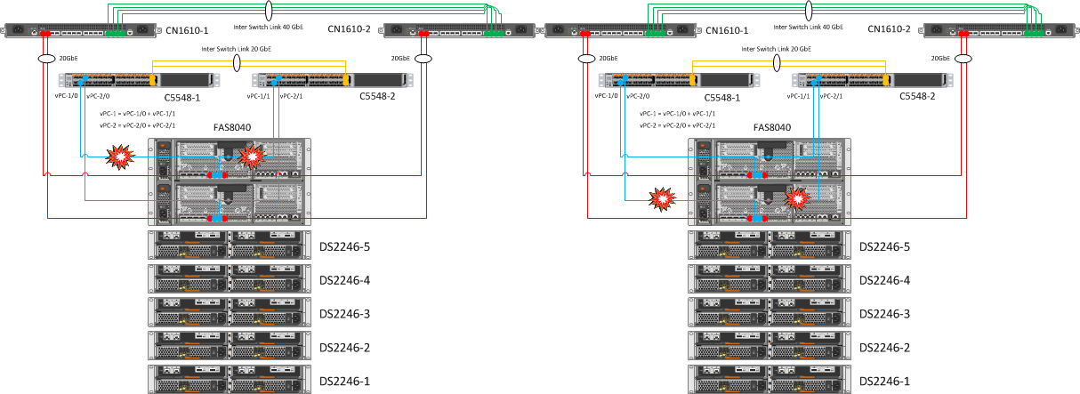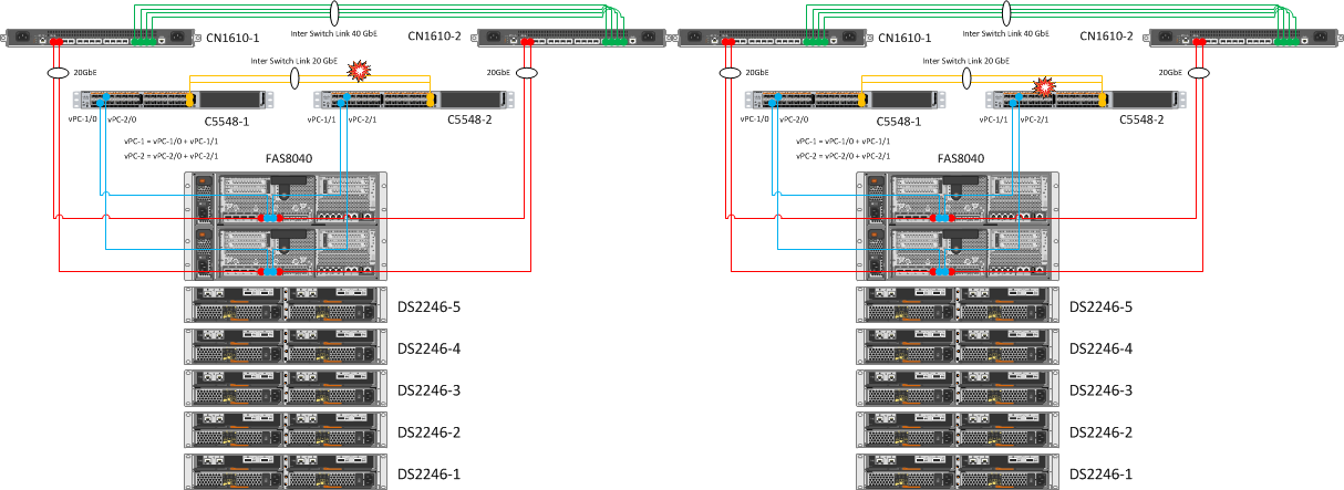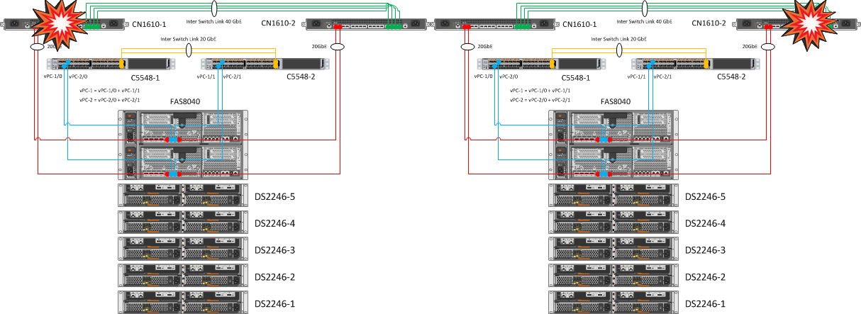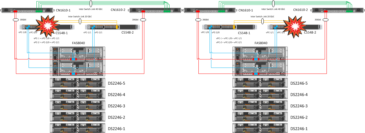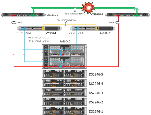 Контроллеры NetApp остаются собранными в кластер через второй свитч CN1610. Дублирование кластерных свитчей и линков до контроллеров позволяет безболезненно переносить падение одной железки CN1610. В результате дублирования линков и объединения их в Port Channels, перезагрузка одного из Nexus 5548 не вызвала никаких эмоций.