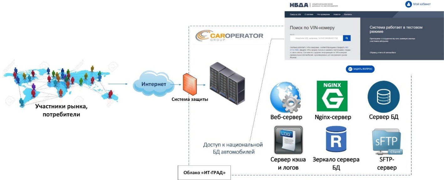 Задача проекта заключалась в создании единой БД по автомобилям, представленным на российском рынке, для получения достоверной информации об истории и пробеге по уникальному номеру VIN. В результате потребовалось организовать надежную инфраструктуру, и облако в модели IaaS здесь сыграло ключевую роль. На облачной площадке провайдера разместились отдельные компоненты НБДА, включая Nginx — программный балансировщик сетевой нагрузки, сервер приложений, работающий с базой данных, сервер кэша и логов, сервер баз данных, зеркало сервера базы данных, сервер для хранения файлов и другие компоненты.