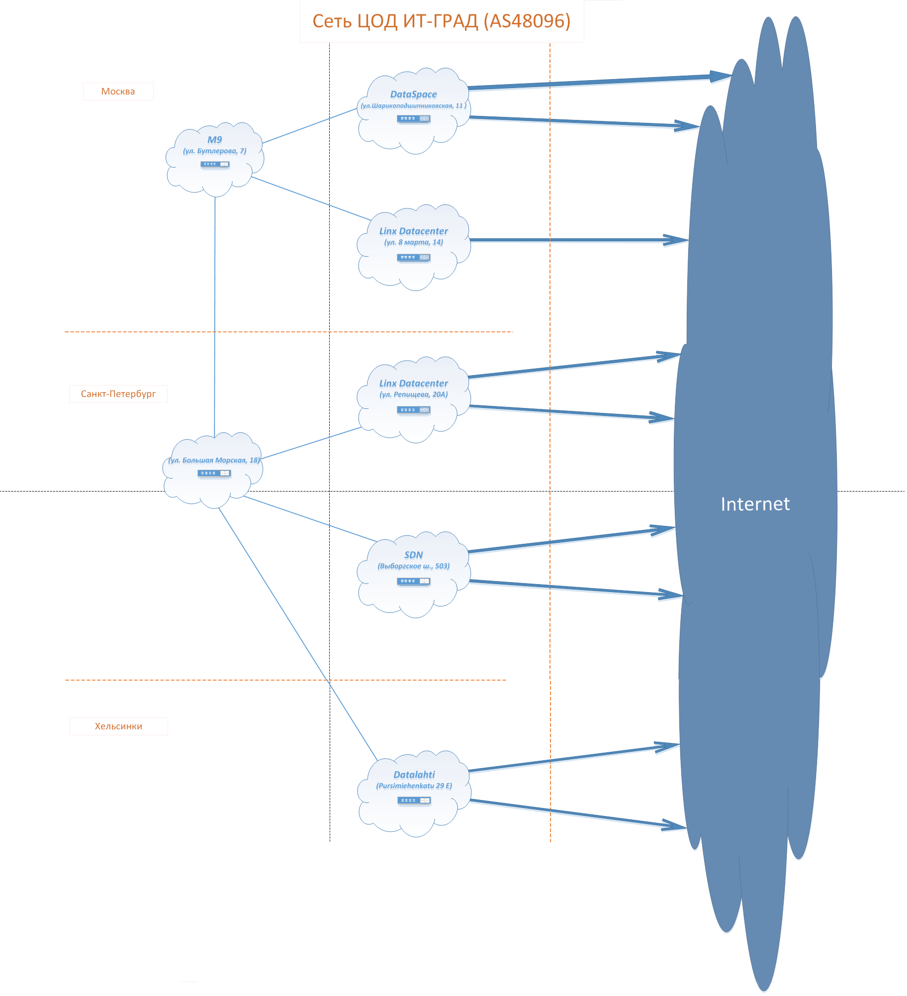 Тонкими линиями обозначены выделенные каналы между ЦОДами, толстыми — каналы в интернет от провайдеров (bgp). Все каналы связи с интернетом задублированы либо отдельными каналами, либо каналом в интернет через другие ЦОДы.