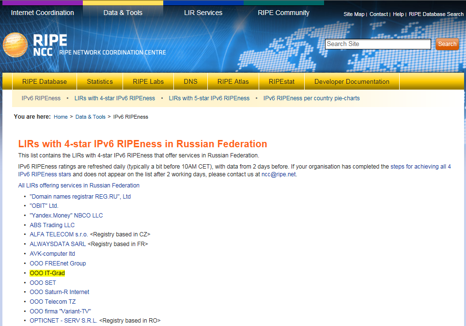 RIPE NCC ведет список «4-star», в котором регистрирует компании, перешедшие на IPv6 и выполняющие ряд условий: