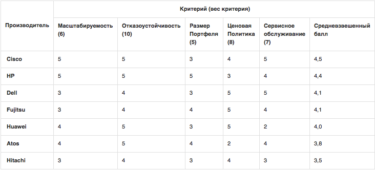 Распределив веса критериев с точки зрения соотношения цены и качества сравниваемых платформ, мы получили средневзвешенный был, который позволил определить тройку лидеров: Dell, HP и Fujitsu.