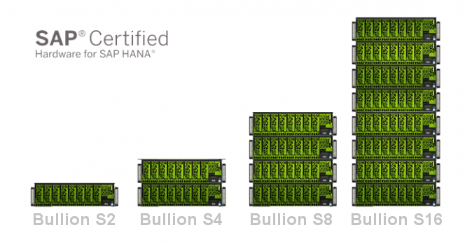 Серверы Bullion S для SAP HANA представляют собой полностью предынтегрированное устройство и масштабируется до своих максимальных значений в пределах единого решения, в отличие от некоторых конкурентов в своем сегменте, при достижении предела в которых появляется необходимость перехода на более старшие и дорогостоящие модели. То есть при любых масштабах развертывания будет расти одна платформа и не возникнет необходимость ее замены и перехода на «старшую» модель.