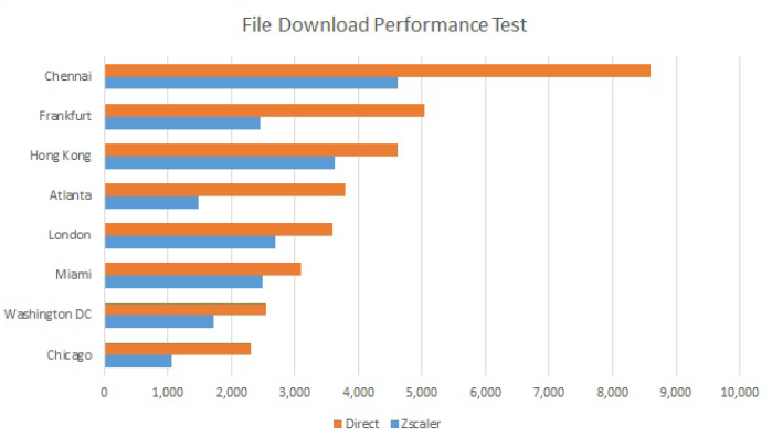 Если у компании есть сайт, работающий под управлением Microsoft SharePoint, то использование Zscaler позволит сократить время загрузки файлов. На следующем графике показаны результаты теста по скачиванию файла размером 3 Мб с сайта SharePoint, размещенного в США: