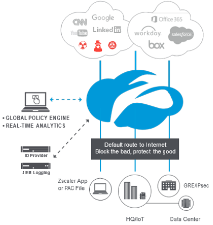 Zscaler Internet Access находится посередине между пользователем и ресурсами Интернет. Сервис анализирует весь трафик, даже если он зашифрован при помощи SSL (с задержкой не более 1 мкС).