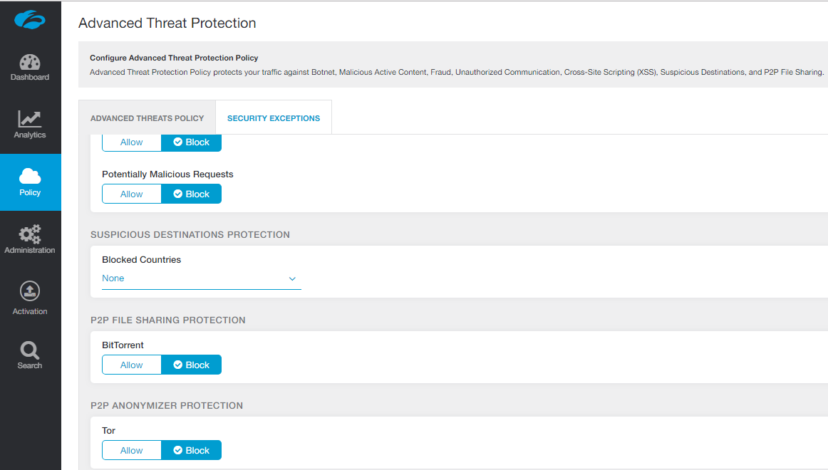 Не секрет, что многие люди не любят подобных ограничений, и стремятся преодолеть их при помощи разнообразных технологий. Одной из таких технологий является Tor. Посмотрим, как Zscaler позволяет ограничить использование таких технологий. Для этого настроим политику Advanced Threats Protection.