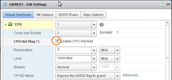 Настройка опции CPU Hot Add