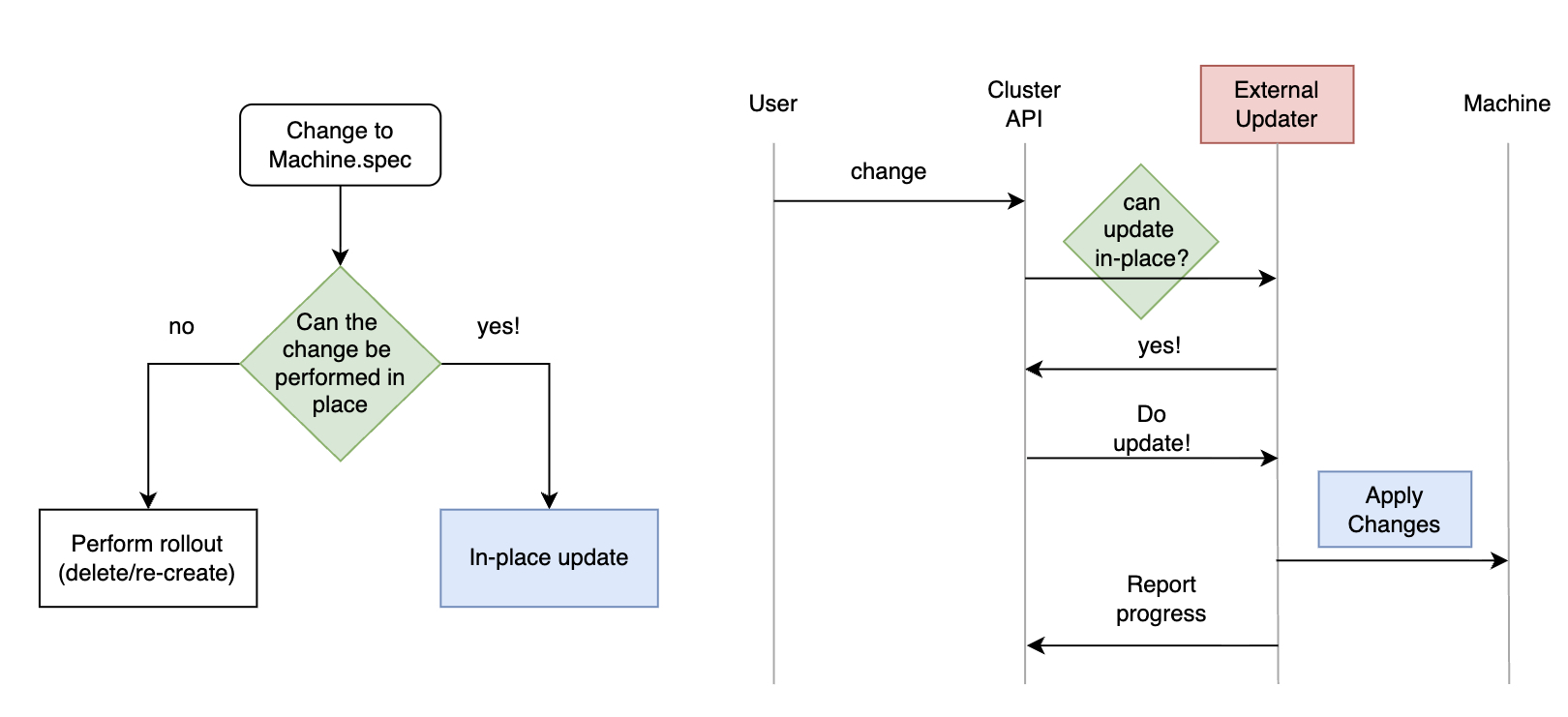 Если по какой-то причине вы хотите выполнить такие изменения без полного rollout машины, Cluster API предоставляет точки расширения, позволяющие выполнить тщательно проверенный набор обновлений «на месте» безопасным и полностью автоматизированным способом. Даже в этих случаях конфигурационный дрейф предотвращается за счёт одинакового применения изменений ко всем машинам.