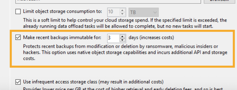 Функция Immutability в Veeam Backup and Replication 10 позволяет организовать блокировку файлов резервных копий, отправленных в объектное хранилище для предотвращения их удаления программами-вымогателями (Ransomware). Например, вы ставите такую блокировку (immutability flag) на 3 дня, чтобы защитить бэкапы не только от Ransomware, но и от потенциальных вредоносных действий собственных администраторов. В течение этого времени никто, включая администраторов, не сможет удалить эти резервные копии из облака S3.