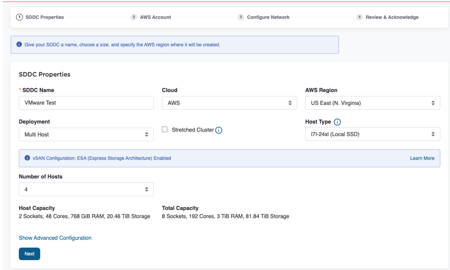 Выберите Create SDDC и укажите тип хоста i7i.metal-24xl.