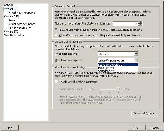 В связи с выходом пакетов обновлений ESX Server 3.5 Update 2 и VirtualCenter 2.5 Update 2 появилось ряд изменений, касающихся работы хостов VMware ESX и VirtualCenter. В частности эти изменения затронули настройку кластера высокой доступности VMware HA. Теперь при создании нового кластера HA на VirtualCenter 2.5 Update 2 действие, производимое при изоляции хоста VMware ESX (Host Isolation response), по умолчанию установлено в значение «Leave VM powered on» (оставить включенной). Это означает, что по умолчанию при потере сетевых соединений хоста VMware ESX, виртуальные машины остаются включенными. Данное изменение является значимым в связи с тем, что ранее по умолчанию данное значение было установлено в «Power off VM» (выключение виртуальной машины в случае изоляции хоста VMware ESX).
