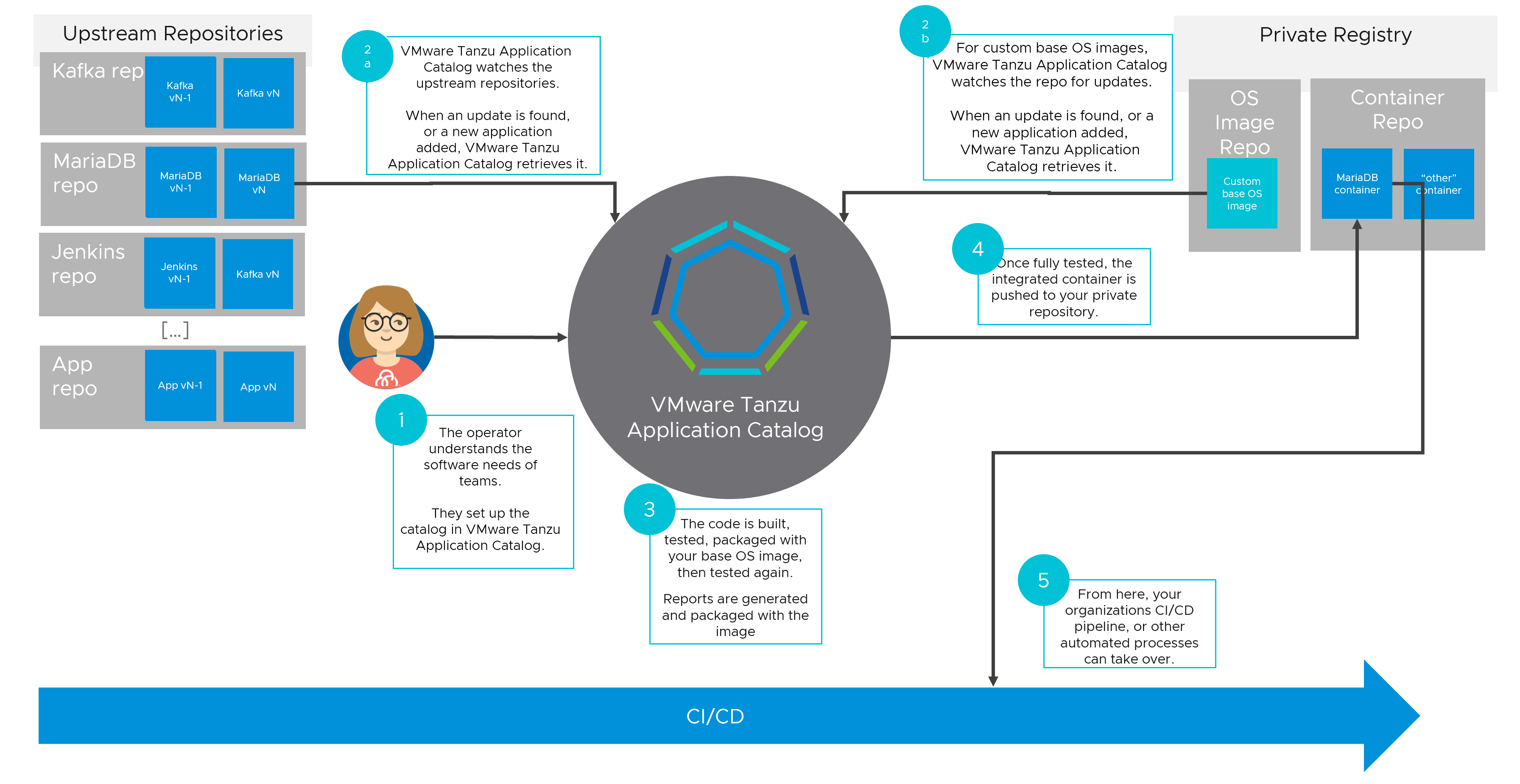 VMware Tanzu Application Catalog (TAC) — это платформа для управления и распространения контейнеризованных приложений, предназначенная для корпоративных клиентов. Основная цель TAC — обеспечить разработчиков и ИТ-специалистов надежными, безопасными, готовыми к развертыванию и эксплуатации контейнерами с программным обеспечением, чтобы ускорить разработку и развертывание приложений.