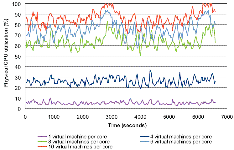 Ниже приведен пример оценки времени отклика для различного соотношения виртуальные машины/ядро.