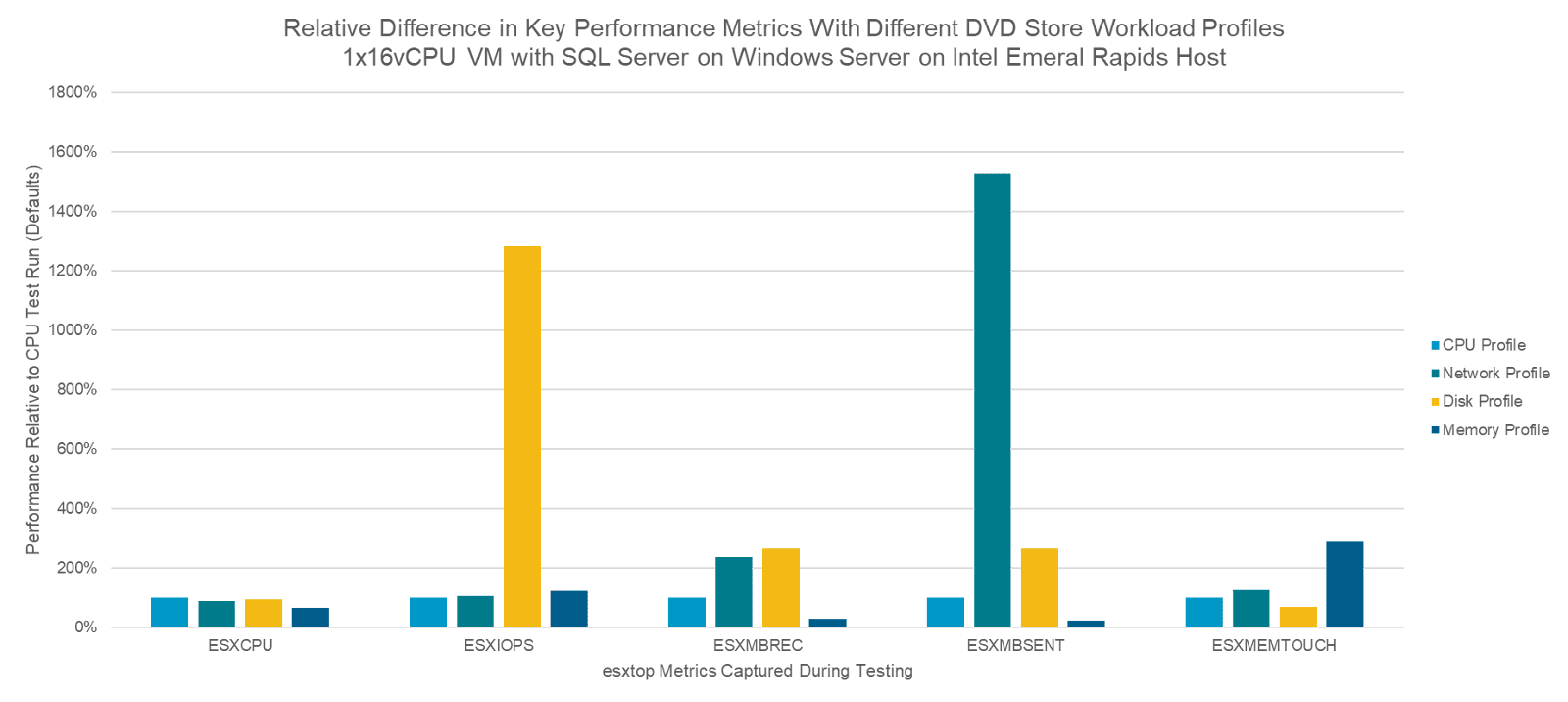 VMware провела тестирование тестирование платформы VMware vSphere с помощью этого инструмента для того, чтобы понять, насколько эти профили меняют поведение нагрузки относительно стандартного CPU-ориентированного сценария. Все измерения проводились на одной виртуальной машине, развёрнутой на сервере ESX 9.0 платформы VMware Cloud Foundation (VCF). ВМ работала под управлением Windows Server 2022, в качестве СУБД использовалась SQL Server 2022. Все показатели производительности фиксировались со стороны хоста ESX с помощью утилиты esxtop (аналог linux top, но адаптированный под ESX и собирающий значительно более широкий набор метрик).