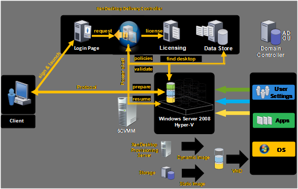 Теперь, в версии 2.1, поддерживается еще и System Center Virtual Machine Manager 2008, управляющий серверами Microsoft Hyper-V. Кроме того, в состав VDI от Citrix включен также новый Provisioning Server for Desktops 5.0.
