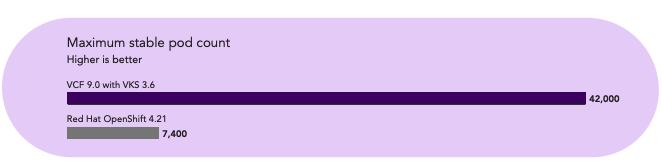 Плотность подов: vSphere Kubernetes Service (VKS) поддержал 42 000 Kubernetes-подов до достижения пределов стабильности. Red Hat OpenShift на bare metal на идентичном оборудовании смог поддержать лишь 7 400 подов. Таким образом, VCF 9.0 обеспечил в 5,6 раза больше подов на узел/хост, чем Red Hat OpenShift, при использовании инструмента kube-burner.