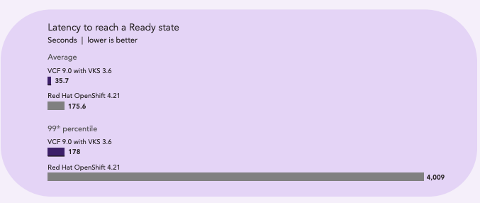 Скорость готовности подов: в среднем VCF 9.0 продемонстрировал задержку в 4,9 раза ниже, чем Red Hat OpenShift, при тестировании инструментом kube-burner. На уровне 99-го процентиля vSphere Kubernetes Service (VKS) оказался быстрее в 22,5 раза при одновременном поддержании почти пятикратно большего количества подов.