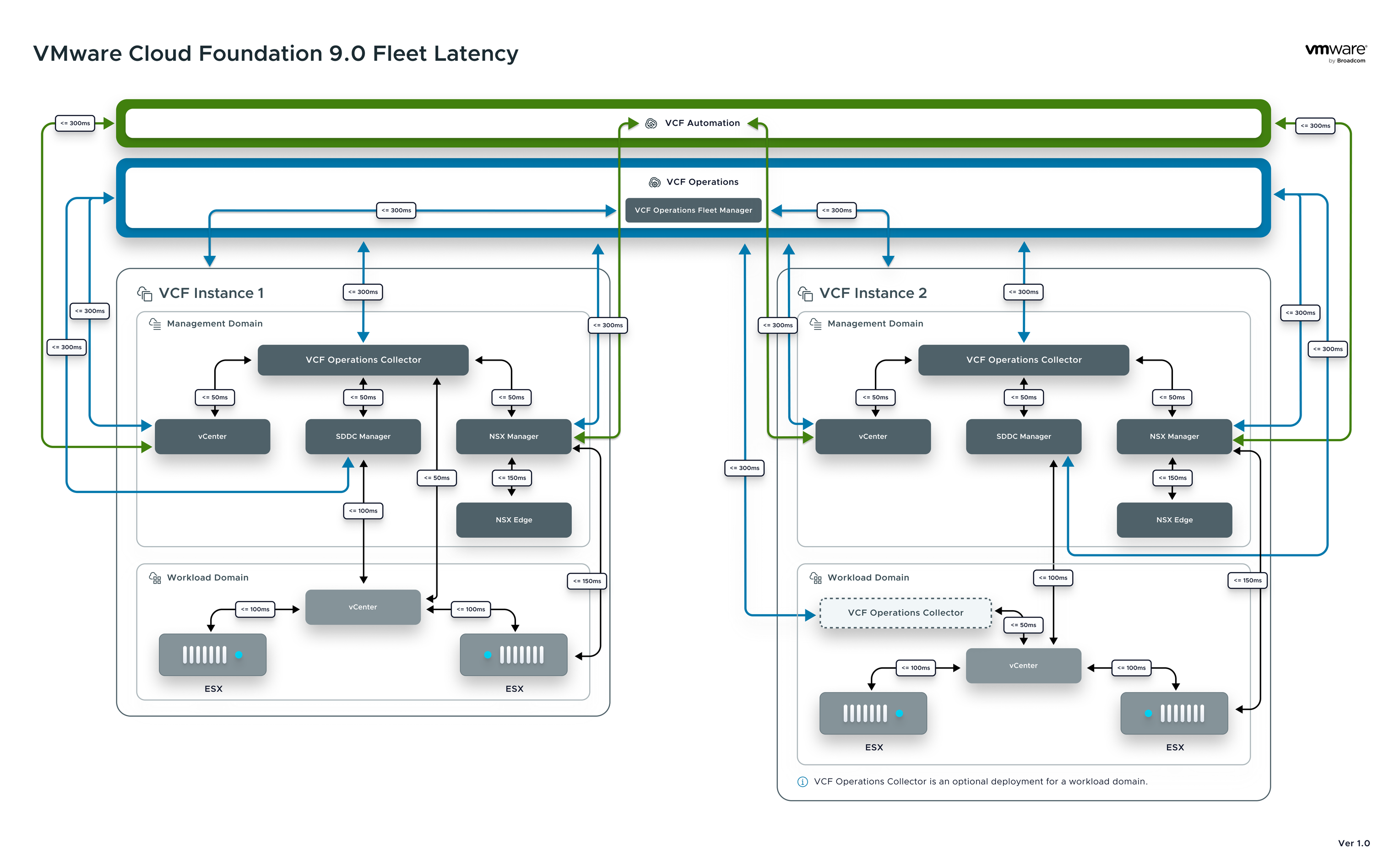 Диаграмма задержек VMware Cloud Foundation 9.0 теперь официально доступна на сайте Ports and Protocols в разделе Network Diagrams > VMware Cloud Foundation. Это официальный и авторитетный источник, который наглядно показывает сетевые взаимодействия и требования к задержкам в VCF 9.0.