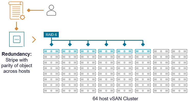 В этом примере предположим, что у нас есть кластер vSAN из 24 хостов, и объект данных ВМ настроен на использование RAID-6 erasure code ы (k=4, m=2, n=6).